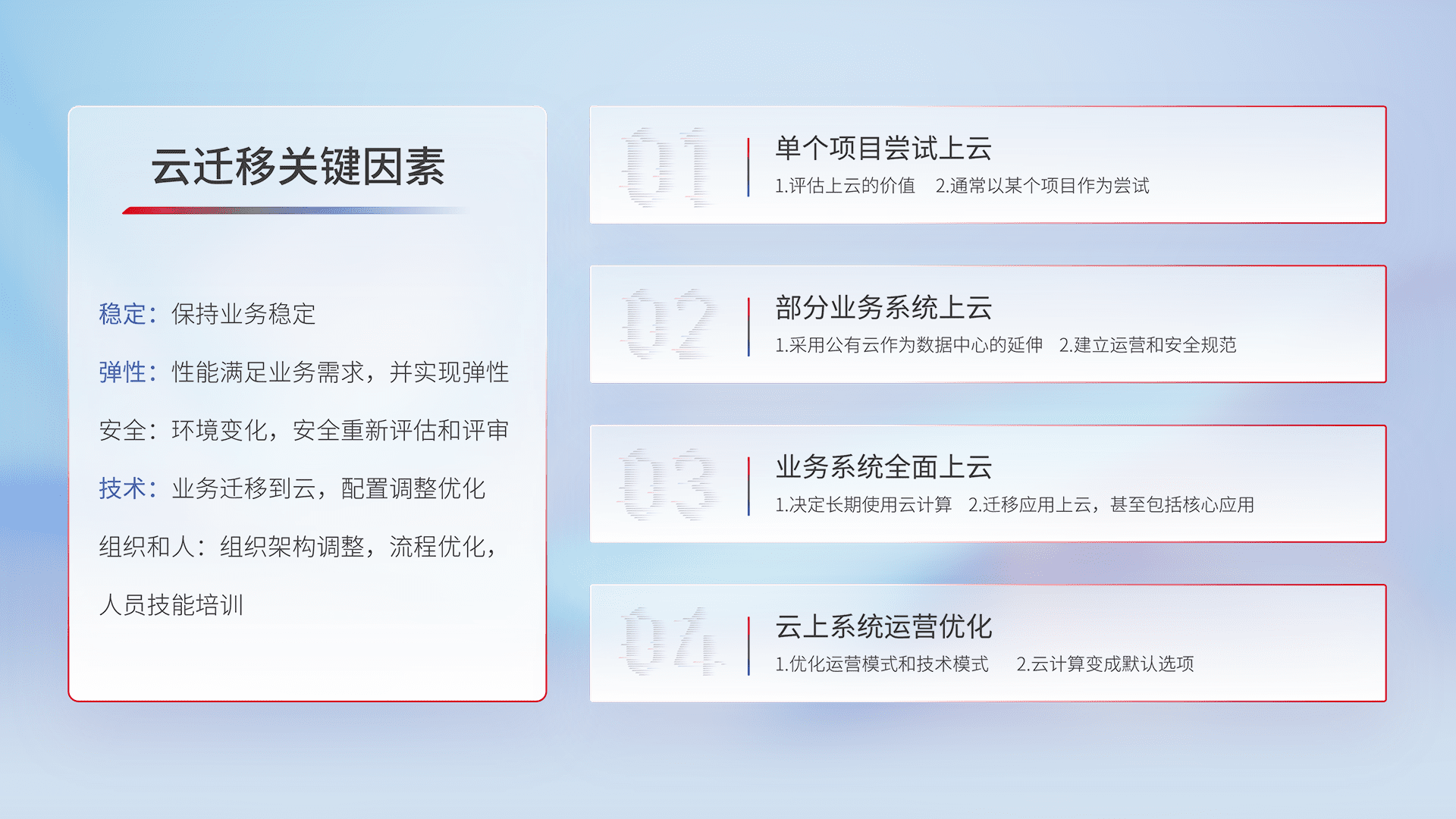结合实际业务,,从规划设计、、、、云平台选型、、、云原生改造、、数据迁移、、集成交付,,,迁移全过程为客户识别最佳上云路径,,做好风险识别管理,,,设计网络架构、、、、身份权限、、、、安全审计合规、、操作审计、、、日志审计、、监控告警策略、、多站点容灾设计等,,对云上基础设施进行整体规划,,,,提升IT治理水平,,,,以满足弹性、、高可用、、、高性能的需求。。。