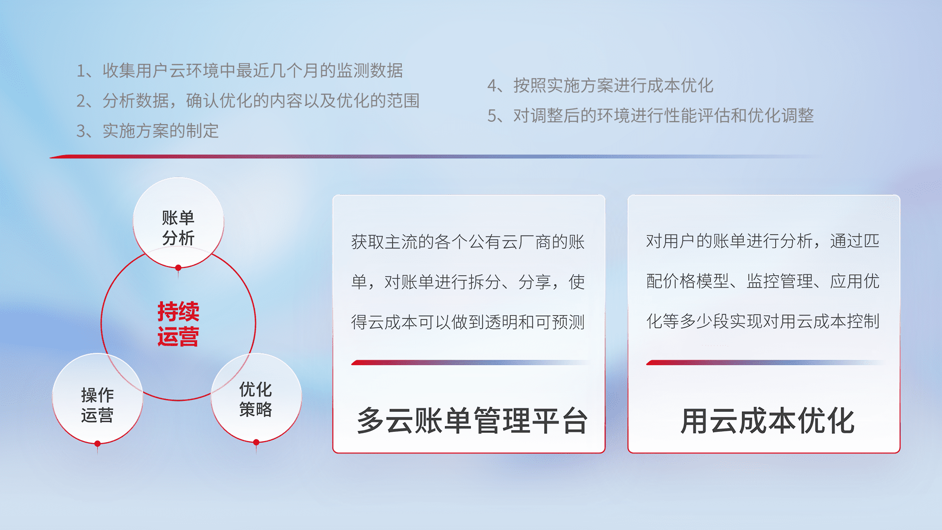 通过多云纳管,,,以统一的资源数据模型把客户的云资源进行抽象和封装,,进而实现对多云资源的统一操作,,,保障云资源管理的可靠性、、、、稳定性与可用性。。。。量身定制化运维内容,,,,配置、、、、开发运维、、补丁管理、、、备份、、、监控、、、、认证和访问管理、、、、审计和日常巡检等,,,保障在用云过程中的可靠度,,,稳定度以及高可用率。。。